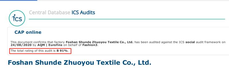 祝佛山市順德區(qū)卓優(yōu)紡織品有限公司在創(chuàng)思維驗廠網(wǎng)輔導(dǎo)下一次性通過AQM審核ICS驗廠取得B級91分