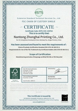 在創思維驗廠網老師專業技術、全程跟進耐心細致輔導以及公司全體員工配合下,一次性順利通過FSC森林認證,為將來公司發展奠定了良好的發展基礎,既開拓了市場同時也增加了消費者對公司的信賴,在這里再次祝賀南通中海印刷有限公司2023年一次性成功通過FSC森林認證,同時也期待未來再次與創思維驗廠網合作!
