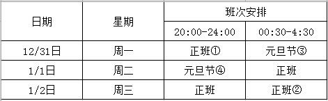 以2019年元旦節(jié)為例。法定節(jié)假日是1月1日,周二工作日。如下圖實例,正班①②為晚班員工的正班工作時段,工廠如未安排員工上班,需支付停工待料工資。元旦節(jié)③4為法定節(jié)假日,如安排員工休息,支付正班工資。